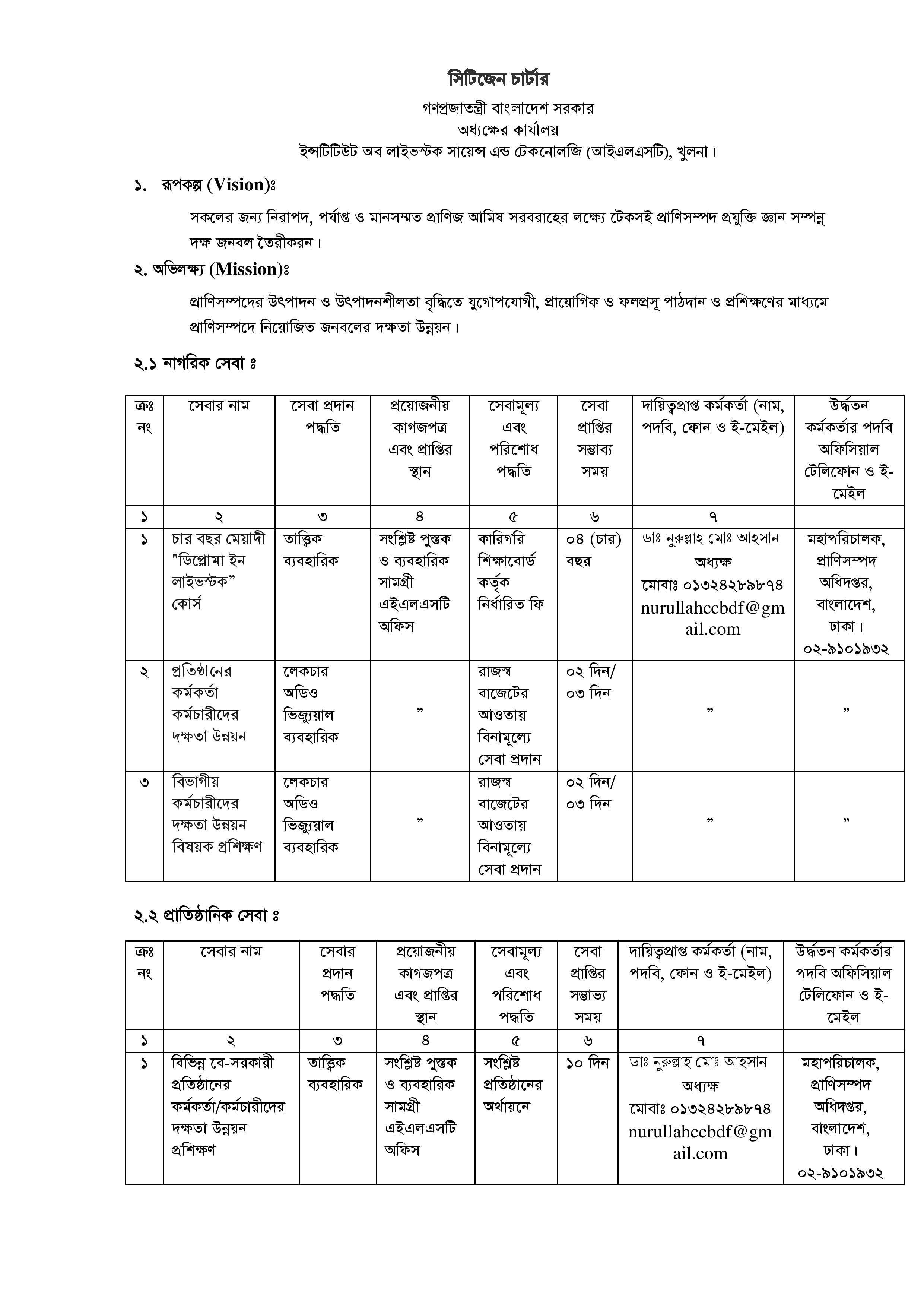 | পরিচালক গবেষণা, প্রশিক্ষণ ও মূল্যায়ন এলআরআই, মহাখালী, ঢাকা-১২১২ টেলিফোন নং ০২-৯৮৪২৯৯১ | সেবা প্রদানকারী কর্তৃপক্ষ অধ্যক্ষ আইএলএসটি, খুলনা মোবাইল নং ০১৩২৪-২৮৯৮৭৪ |